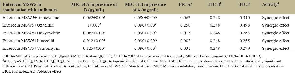 d Activity=S: FICI≤0.5, AD: 0.5≤FIC≤1, No interaction (I): FIC≤4, Antagonistic effect (A): FIC>4. Mean±SE. Different letters above the columns denote statistically significant differences at P<0.05 by Tukey’s test. A: Antibiotics, B: Enterocin MSW5, SE: Standard error, MIC: Minimum inhibitory concentration, FIC: Fractional inhibitory concentration, FICI: FIC index, AD: Additive effect