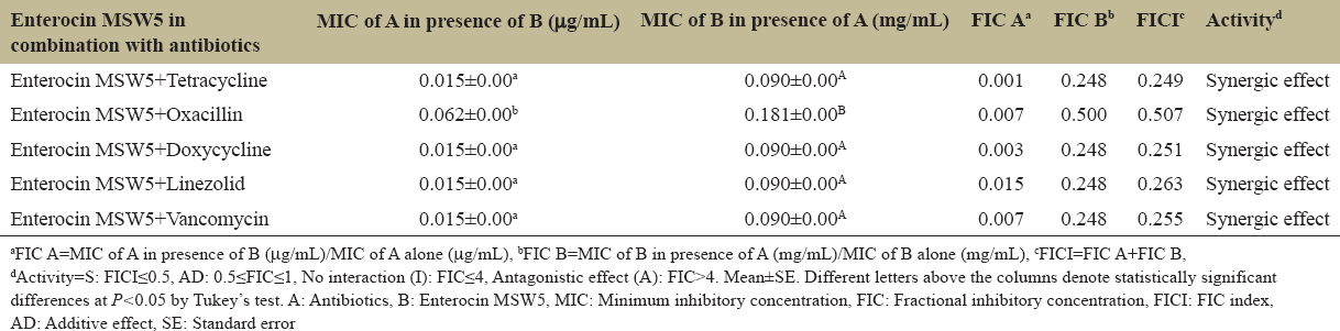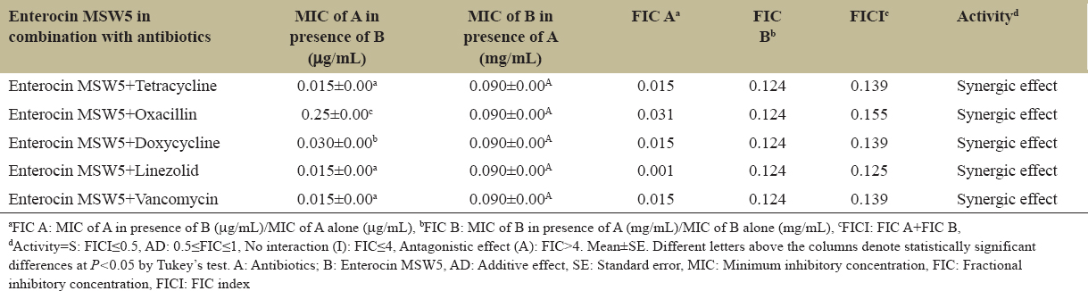 Table 2: Fraction inhibitory concentration of enterocin MSW5 in combination with antibiotics against Staphylococcus aureus American Type Culture Collection 6538.