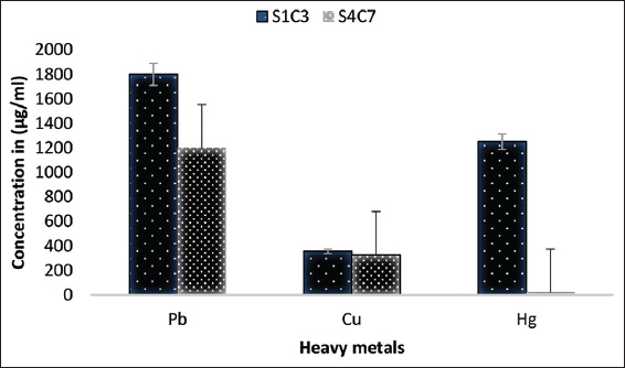 | Figure 4: Minimum inhibitory concentrations of Pb, Cu, and Hg for the selected bacterial isolates. [Click here to view] |