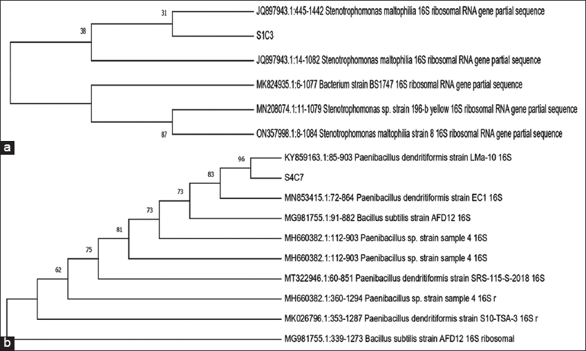 After conducting 16s rRNA sequencing studies and performing partial sequence comparison using NCBI BLAST, S1C3, and S4C7 isolates were identified as Stenotrophomonas maltophilia and Paenibacillus dendritiformis, respectively. The amplified DNAs were then sequenced and compared to those in the Gene Bank database. The comparison showed that strain S1C3 has 94.85% identity and strain S4C7 has 96.65% identity, which was then submitted to the NCBI (Accession No. OP835924 and OP835923). A phylogenetic tree was constructed based on the 16S rRNA gene sequences, and it is presented in Figure 6.