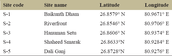 The River Gomati flows centrally through Lucknow city from west to east, covering a distance of around 5 km. A total of five sampling sites were selected for this study. These are the Baikunth Dham (site I), Riverfront (site II), Hanuman Setu-(site III), Shaheed Smarak-(site IV), and Dali Ganj-(site V) [Table 1]. The precise locations where the samples were collected can be visualized on the map provided in Figure 1.