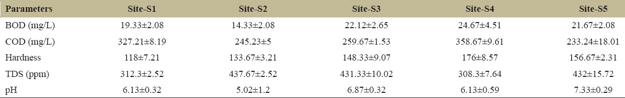 BOD is defined as the amount of dissolved oxygen needed by aerobic biological organisms in a body of water to break down the organic material present in a water sample at a specific temperature and specified period. BOD is a method used to evaluate water quality by calculating the oxygen requirement for decomposing its organic matter. The highest BOD values were found in samples collected from site S4 (24.67 mg/L), while the minimum BOD values were observed in samples from site S2 (14.33 mg/L). Samples from sites S1, S3, and S5 had BOD values of 19.33, 22.12, and 21.67 mg/L, respectively. Similarly, COD is the only method that gives idea about organic load in water. It is the amount of oxygen needed to oxidize organic and inorganic matter present in water by utilizing oxidizing agents such as potassium permanganate, potassium dichromate, etc. Like BOD, the highest COD value was observed in S4 (358.67 mg/L) samples, followed by sites S1 (327.21 mg/L), S3 (259.67 mg/L), and S5 (233.24 mg/L). TDS outlined the presence of total inorganic compounds along with organic matter. From the results, it could be inferred that TDS had a peak tendency in S2 (437.67 mg/L) and S3 (431.33 mg/L), while the minimum TDS was observed in S4 (308.3 mg/L). A summary of the comparative analysis of the physicochemical parameters of the collected samples is presented in Table 2.