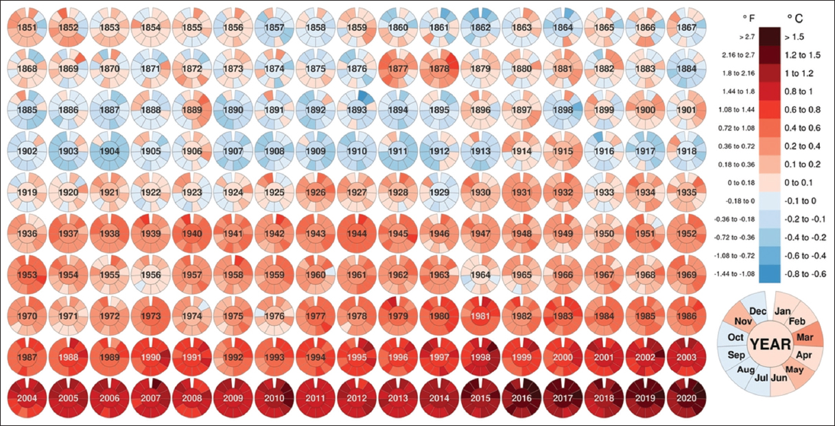 | Figure 2: The changes in monthly mean global temperature from 1851 to 2020 (Data HadCRUT5 created by: @neilrkaye). [Click here to view] |