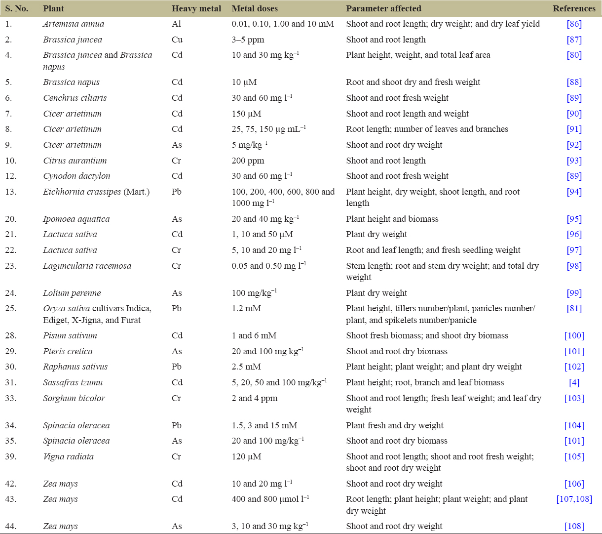 | S. No. | Plant | Heavy metal | Metal doses | Parameter affected | References |
