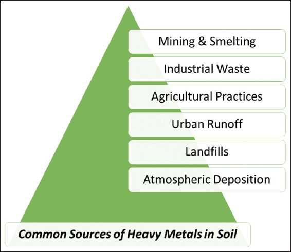 | Figure 1: Sources that commonly contribute to heavy metal contamination in soil such as mining and smelting, industrial waste, agricultural practices, urban runoff, landfills, and atmospheric deposition. [Click here to view] |