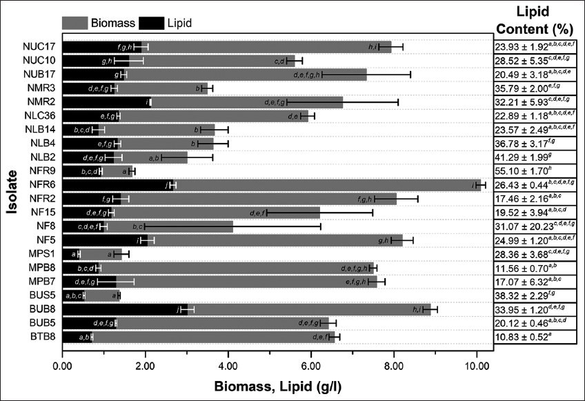 | Figure 2: Biomass and lipid production and lipid content of the isolates. Values that share the same italicized letters are not statistically different. [Click here to view] |