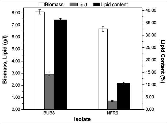 The capabilities of NFR6 and BUB8 for lipid production from glycerol were tested.
