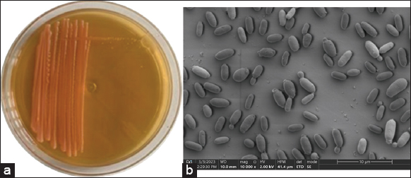 | Figure 4: Appearance of BUB8 cells in petri plate (a) and under SEM (b). [Click here to view] |
