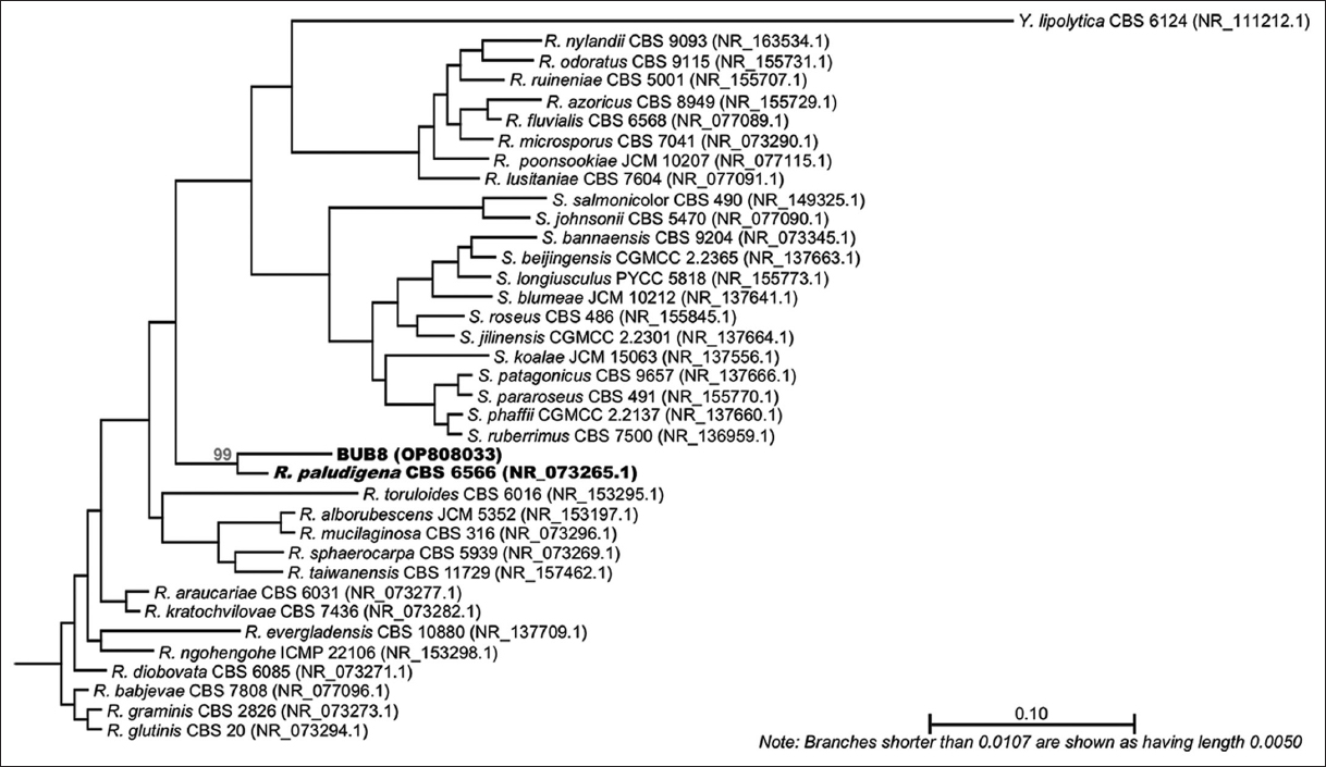 ITS-PCR is widely used for the rapid identification and taxonomic study of yeasts from various sources [27,63-65]. To identify strain BUB8, the 5.8S-ITS rDNA was amplified, sequenced, and compared against available sequences. Phylogenetic analysis showed that BUB8 shares 99% identity with Rhodotorula paludigena [Figure 5]. The evolutionary tree showed the relationship of Rhodotorula spp. with related genera such as Sporidiobolus and Sporobolomyces, all of which belong to the Order Sporidiobolales, subphylum Pucciniomycotina. These genera are referred to as the “red yeasts,” producing pigmented colonies [66,67]. Rhodosporidiobolus is more closely related to Rhodotorula than to Sporobolomyces as shown in the tree [68]. Rhodotorula species are lipid-accumulating yeasts that have been considered to produce microbial oils as biodiesel feedstock [69-72].