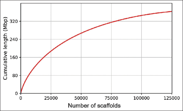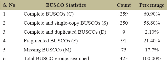 The whole-genome sequence data of 28.96 GBs from NCBI Bio project PRJNA610008 is retrieved. There were 194,645,804 reads, 44.237% of G.C. content, and 94.72% data ≥Q30 with read length 2 × 150bp. The adapter removal and quality trimming resulted in 194,640,684 reads, 44.23% of G.C. content, and 94.8% data ≥Q30. The genome size of 454,049,232 bps is predicted for lemon grass [Supplementary Figure 1]. The de-novo assembly generated 127,303 scaffolds, with an assembly size of 364,442,032 bps. The longest scaffold is 67,673 bps, and the shortest scaffold is 301 bps. Table 1 presents the genome estimation summary of lemon grass. The assembled genome’s G.C. content and scaffold length distribution are calculated and shown in Supplementary Figures 2 and 3, respectively. The G.C. content of the assembled genome is ~43.86%. The evaluation of the genome using BUSCO version 4.1.2., predicted that the genome assembly of lemon grass was complete by 60.9% [Table 1 and Supplementary Table 1].
