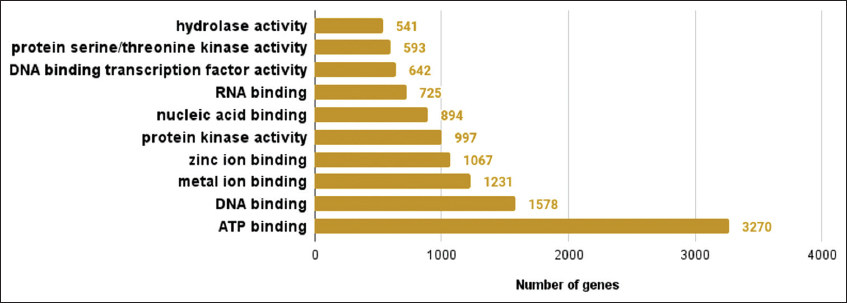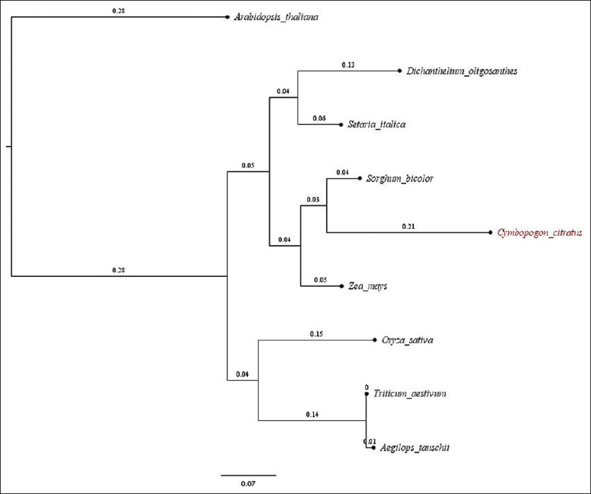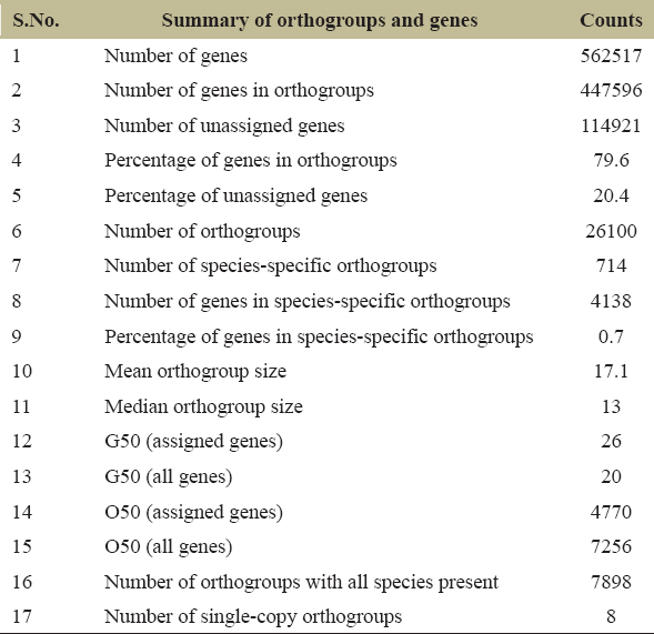 The gene prediction based on AUGUSTUS version 3.3.2 revealed 41,775 genes. Nearly 34,239 were annotated based on best hits with the UniProt protein database [Table 1]. InterproScan was used to annotate genes resulting in the annotation of 34,348 genes. The KEGG analysis predicted many significant pathways in lemon grass. The Gene Ontology categorization identified 1745 genes associated with biological processes, 484 genes related to cellular components, and 1373 genes linked with molecular function [Supplementary Figures 4-6]. The Mapman analysis identified 43.09% of genes having a significant role in metabolic pathways [Supplementary Figure 7]. Plant metabolic network analysis identified 8550 genes associated with metabolic pathways. A linear tree presents phylogenetic relationships of nine species based on the maximum likelihood method [24,33]. It is viewed in Figtree [34] to understand the phylogenetic relationship between the models and C. citratus, as shown in Supplementary Figure 8. The linear tree showed that lemon grass is close to S. bicolor, followed by Z. mays, S. italica, and D. oligosanthes. The orthologous study considered 562,517 genes, and nearly 447,596 (79.57%) genes are in orthogroups. The number of orthogroups identified in this study is 26,100, and Supplementary Table 4 presents the orthologous summary.