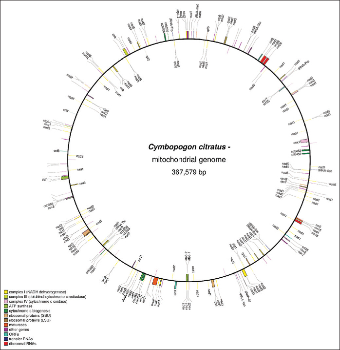 A complete circular mitochondrial genome of 367,579 bps was generated and annotated without any gap for lemon grass.