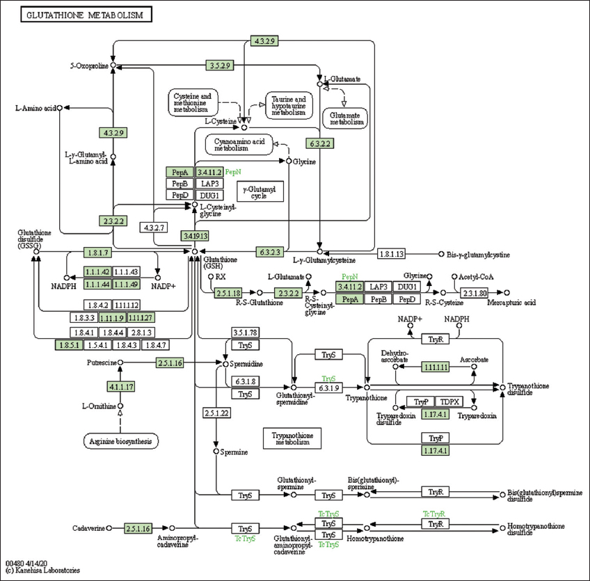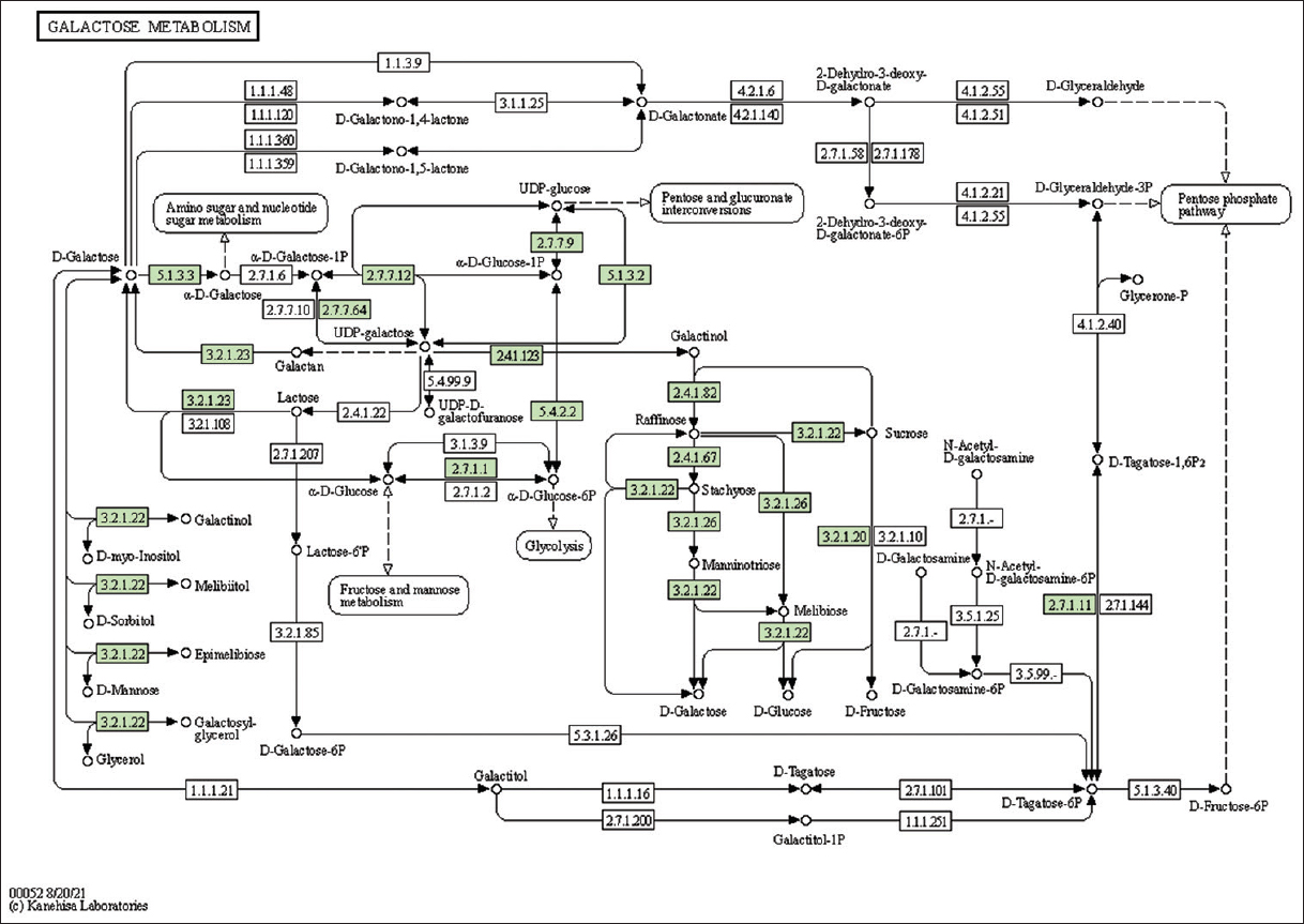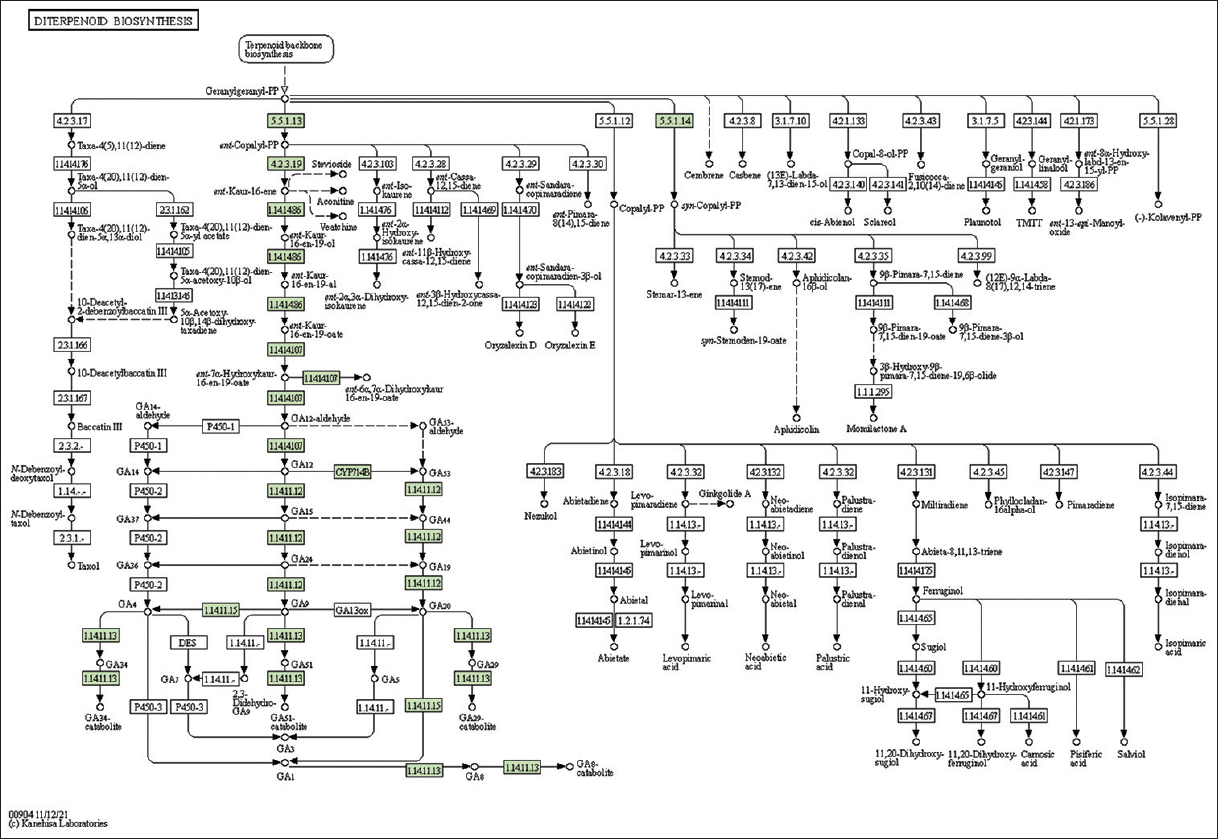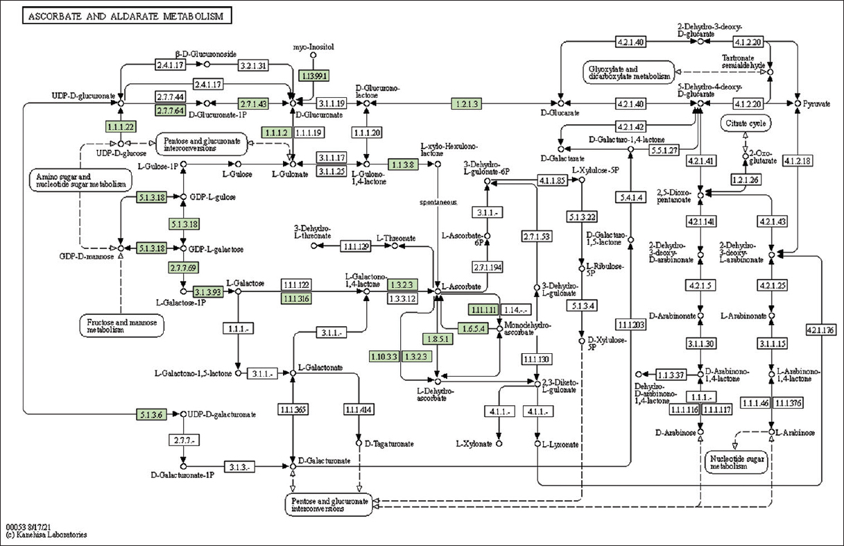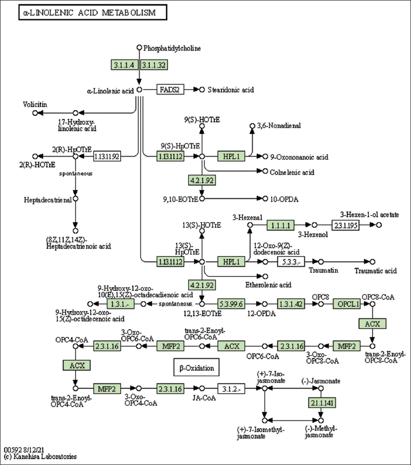 The study identified genes associated with metabolites and secondary metabolites of lemon grass. Metabolites and secondary metabolites are essential for producing essential oils in lemon grass. Table 2 summarizes lemon grass’s KO ID, gene count, and metabolic pathways [Figure 1 and Supplementary Figures 11-33]. The number of genes identified in purine metabolism, cysteine and methionine metabolism, glycerophospholipid metabolism, pyruvate metabolism, starch and sucrose metabolism, and pyrimidine metabolism is 43, 43, 35, 32, 31, and 30, respectively. Similarly, this study identifies fifteen genes in sulfur metabolism, sphingolipid, alpha-Linolenic acid, phenylalanine, tryptophan, and Beta-alanine.