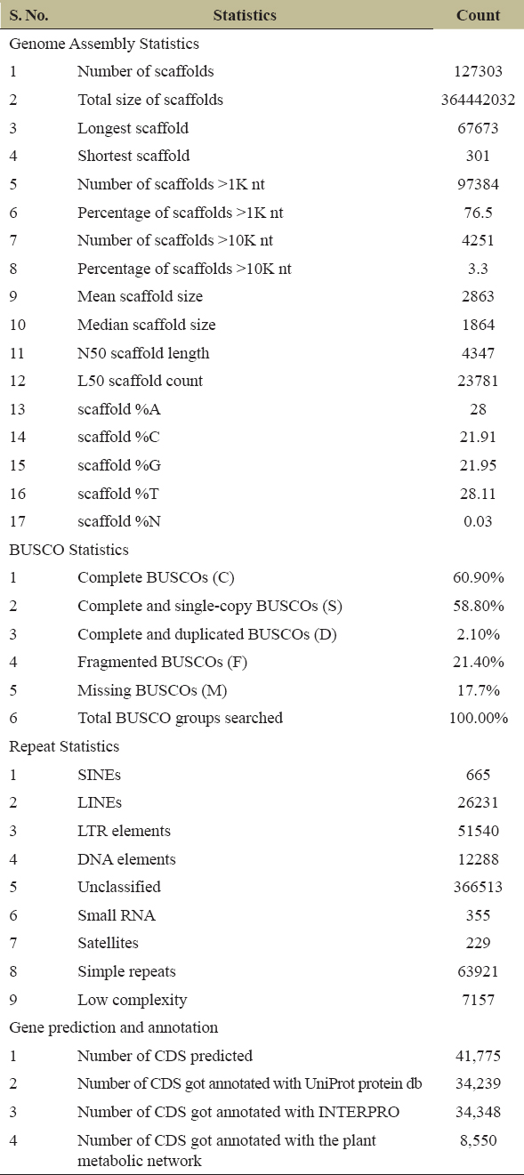Table 1: The summary of genome assembly, BUSCO score parameters, repeats, gene prediction, and annotation on lemon grass