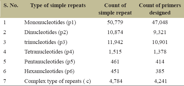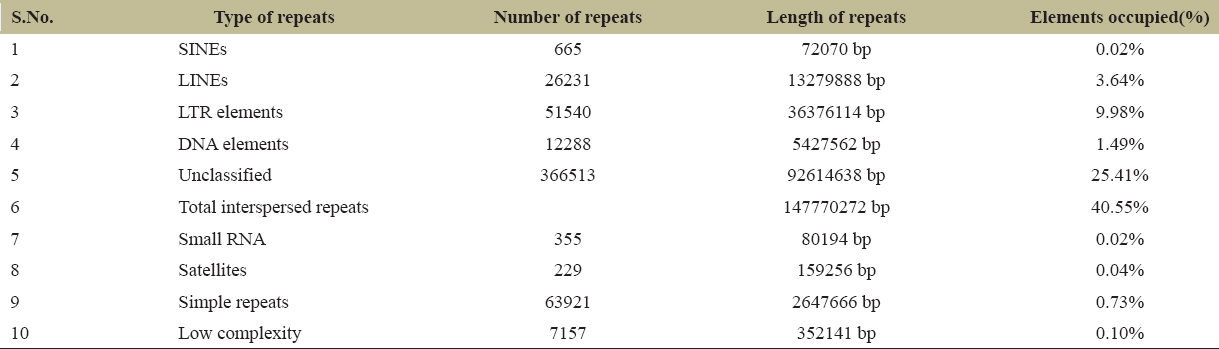 The repeat analysis predicted that 41.66% of the genome contains repetitive elements. Table 1 and Supplementary Table 2 provides the repeat classification. The repeat classification revealed 0.02% of SINEs, 3.64% of LINEs, 9.98% of LTR elements, 1.49% of DNA elements, and unclassified repeats of 25.41%. The analysis revealed 50779, 10874, 11942, 1515, 461, 451, and 4784 mono-nucleotide repeats, di-nucleotide repeats, tri-nucleotide repeats, tetra-nucleotide repeats, penta-nucleotide repeats, hexa-nucleotide repeats, and complex type repeats, respectively [Supplementary Table 3]. Out of the simple repeats predicted, the primers were designed successfully for 47,048 mono-nucleotides, 9321 di-nucleotides, 10,901 tri-nucleotides, 1378 tetra-nucleotides, 414 penta-nucleotides, 385 hexa-nucleotides and 4241 complex type repeats [Supplementary Table 3]. The tRNAs identified in the assembly of lemon grass are 681.