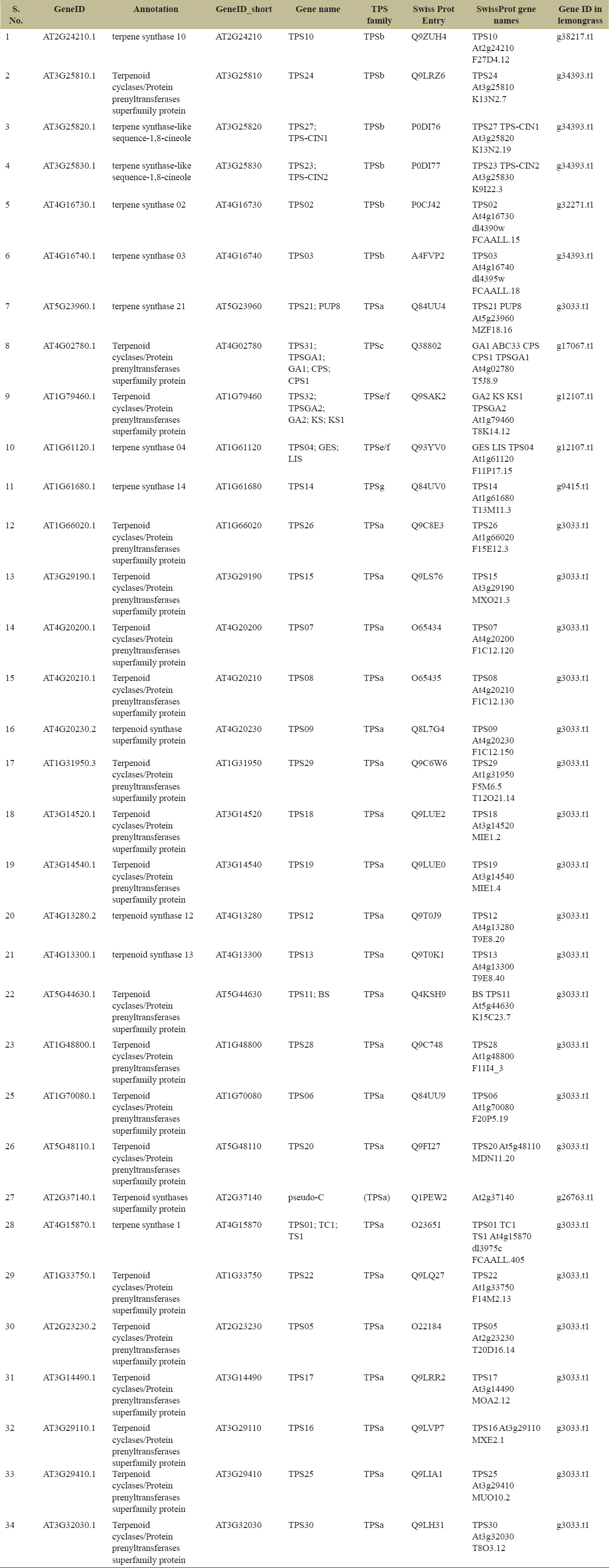 | S. No. | GeneID | Annotation | GeneID_short | Gene name | TPS family | Swiss Prot Entry | SwissProt gene names | Gene ID in lemongrass |