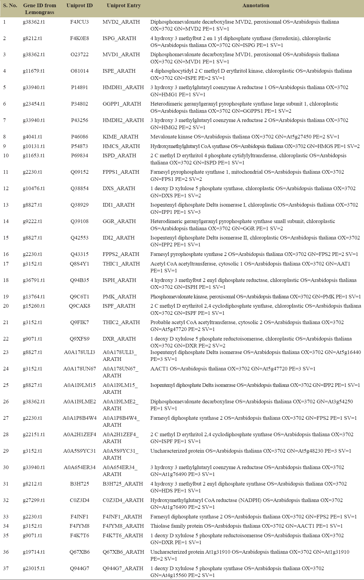 | S. No. | Gene ID from Lemongrass | Uniprot ID | Uniprot Entry | Annotation |