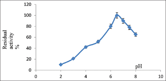 The relative activity of PPO from Mediterranean palm hearts was determined at different pH values ranging from 2 to 8 using catechol as substrates [Figure 1]. PPO activity decreases when pH decreases. The optimal pH value is about 6.5, and activity was 3132 ± 57 (Units/min). Using catechol as substrate, the optimum pH of PPO activity from plants is usually in a pH range of 4–7.4. The optimum pH is 6.5 for rooster potato (Solanum tuberosum cv. rooster) [38] PPO, 6.8 for prawns [7,9] for buriti [8], and 5 for potato tuber PPO [39].