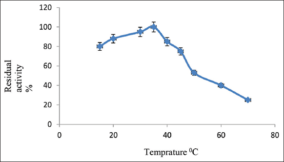 | Figure 2: Effect of temperature on Mediterranean palm heart polyphenol oxidase activity. [Click here to view] |