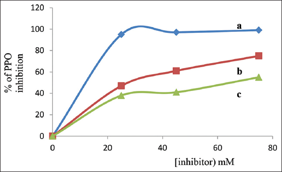 | Figure 3: Percent inhibition of some chemical inhibitors on Mediterranean palm heart polyphenol oxidase activity: (a) L-cystein, (b) sodium florid, and (c) citric acid. [Click here to view] |