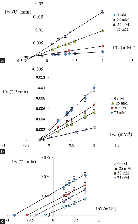| Figure 4: (a) Lineweaver-Burk plots using catechol as a substrate in the presence of L-cystein. (b) Lineweaver-Burk plots using catechol as a substrate in the presence of sodium florid (c) Lineweaver-Burk plots using catechol as a substrate in the presence of citric acid. [Click here to view] |