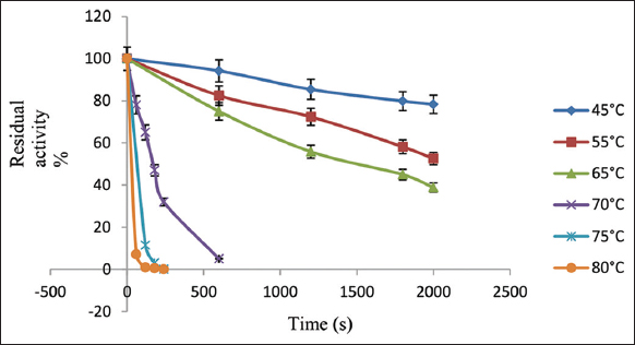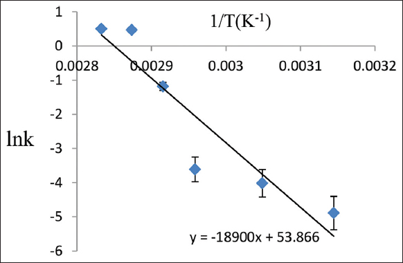 Rate constants k of inactivation were calculated from linear regression of experimental enzyme retention data of the slopes of log % residual activity against time [19]. The kinetic parameters k, t1/2, and D are presented in Table 3. The activation energies, Ea, were calculated using the Arrhenius equation [7] [Figure 6]. Then ΔG, Gibbs free energy, and ΔH, the change in enthalpy, were calculated [Table 3].