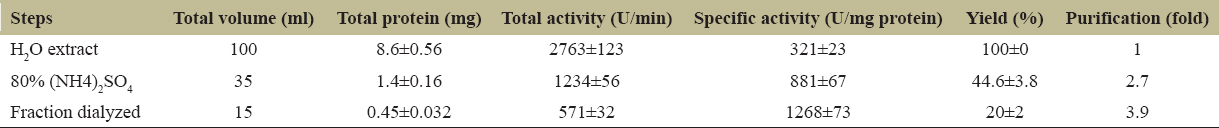 | Steps | Total volume (ml) | Total protein (mg) | Total activity (U/min) | Specific activity (U/mg protein) | Yield (%) | Purification (fold) |