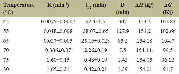 | Temperature (°C) | K (min-1) | t1/2 (min) | D (min) | ΔH (Kj) | ΔG (Kj) |