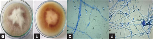| Figure 1: Fungal culture of Fusarium solani: (a) front view of fungal culture on SDA growth media, (b) rear view of fungal culture on SDA growth media, and (c and d) lactophenol cotton blue staining depicting the fungal spores and mycelium. [Click here to view] |