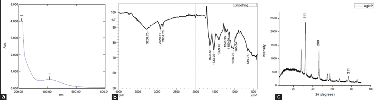 | Figure 3: Characterization of silver nanoparticles from Fusarium solani: (a) UV–visible Spectrum depicting the peak obtained corresponding to AgNP, (b) FTIR spectrum depicting the functional groups detected in AgNP, and (c) XRD analysis of AgNP. [Click here to view] |