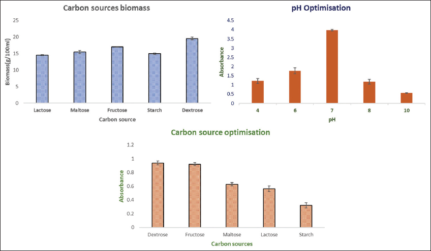 | Figure 4: pH and carbon source optimization for maximum pigment production by endophytic Fusarium solani. [Click here to view] |