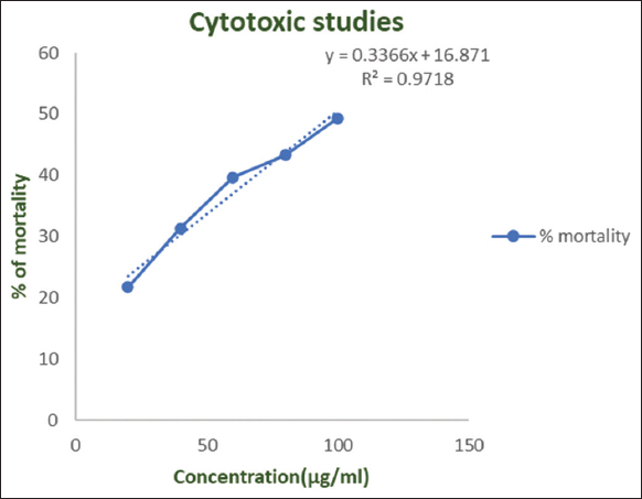 | Figure 7: Brine shrimp lethality bioassay depicting the cytotoxic activity of Fusarium solani fungal pigment extract. [Click here to view] |