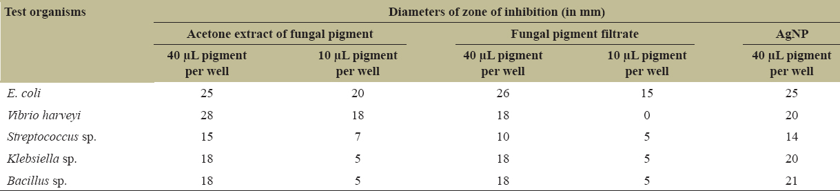 The fungal pigment filtrate, the acetone extract of fungal pigment, and fungal AgNP depicted high antimicrobial properties against E. coli, Klebsiella spp., Vibrio harveyi, Streptococcus spp., and Bacillus spp. [Table 1]. The maximum zone of 28 mm was observed in the acetone extract against Vibrio harveyi. The maximum zone of 26 mm among the filtrate was shown against E.coli. This indicates that the pigment showed better antibacterial properties against the tested Gram-negative bacteria. The maximum ZOI was shown against E. coli. Negative control and vehicle control DMSO did not exhibit any zones of clearance. These results indicate that this fungal pigment could be potentially developed as an antibiotic drug. In a study by Saravanan and Radhakishnan, the pigment produced by the fungal isolate MF5 showed a broad spectrum of antibacterial activity [60]. In East Asia, fungal pigments produced by Aspergillus niger and Monascus purpureus were employed as natural colorants and food additives. Growth and pigment production of the fungus Talaromyces verruculosus had been optimized to obtain the highest yield and for its potential application as a replacement for synthetic dyes that are also hazardous [61].