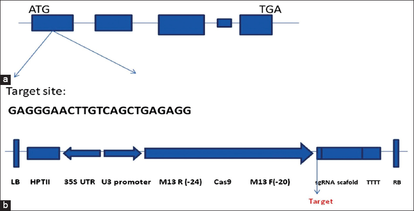 | Figure 2: The target gene’s specifics. (a) Structural representation of the OsHDT gene and the targeted position on the 1st exon to develop sgRNA. [Click here to view] |