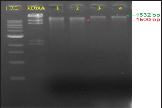 | Figure 4: Restriction digestion of plasmid and recombinant plasmid DNA on 3.5% gel. Lane-1: 1 kb DNA ladder; Lane-λ: Hind III λ DNA marker; Lane-1,2: Plasmid DNA; Lane-3,4: recombinant plasmid DNA. [Click here to view] |