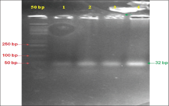 | Figure 5: Polymerase chain reaction (PCR) confirmation of recombinant plasmid. Lane-1: 50bp DNA ladder; Lane-1,2,3,4: PCR confirmation of insert DNA (32 base pairs). [Click here to view] |
