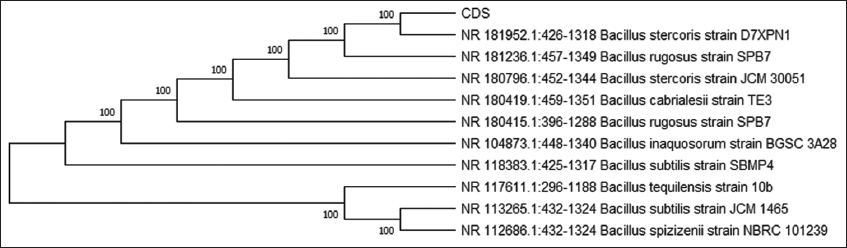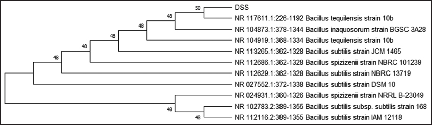 To identify these isolates, 16S rRNA sequencing was performed [Figure 3]. Based on the bioinformatic analysis, the isolates DSS and CDS were found to be Bacillus tequliensis [Figure 4] and Bacillus spp. [Figure 5]. Sequences were submitted to obtain an accession number, and the NCBI database provided unique accession numbers OP412485 and OR142655 for DSS and CDS, respectively.
