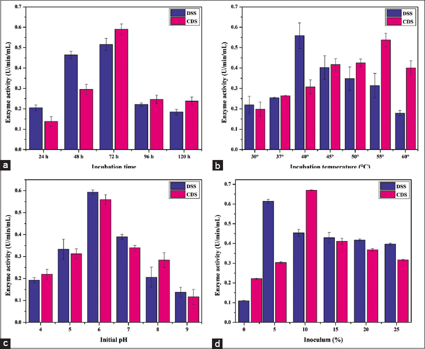 Studies have demonstrated that the production of phytase increases as the percentage of inoculum increases. The maximum concentration of inoculum that affects enzyme production has been reported to be 10% in some cases [7]. However, for fungal cultures, 2% has been identified as the optimized inoculum concentration [23]. In our research, we found that a 5% inoculum played a crucial role in maximizing enzyme production for isolate DSS, whereas for CDS, the highest enzyme activity was achieved with a 10% inoculum [Figure 6d]. These findings underscore the importance of considering inoculum concentration as a key factor in optimizing enzyme production for different bacterial isolates.
