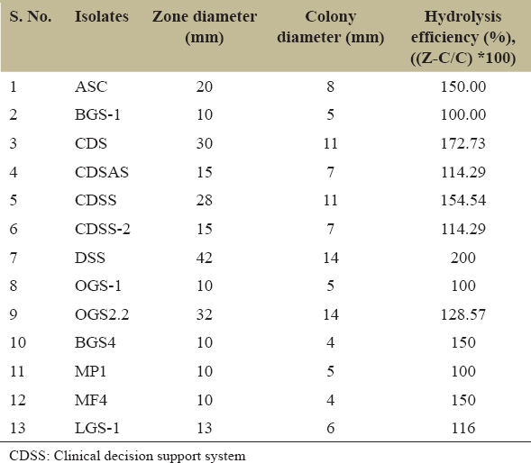 | S. No. | Isolates | Zone diameter (mm) | Colony diameter (mm) | Hydrolysis efficiency (%), ((Z-C/C) *100) |