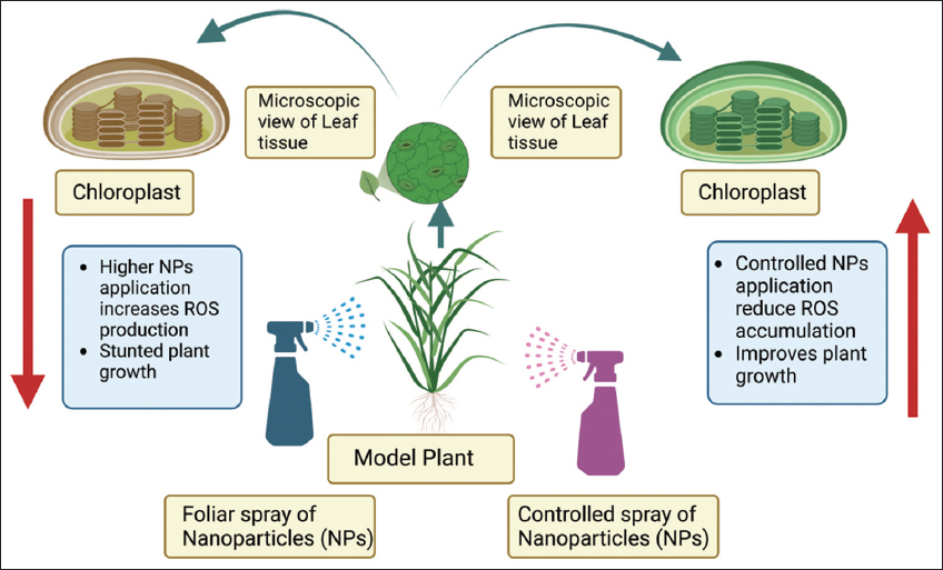 This review has summarized the wealth of data on the ROS generation due to higher accumulation of NPs. Elevated amount of NPs increased the level of MDA and lipid peroxidation which leads to oxidative stress. Enhancement of ROS leads in reduced morpho-physiological attributes and crop yield. NPs altered the polyunsaturated fatty acids, injured cell membrane accessibility and disturbed cell shape, harm protein and DNA, finally cell death. To decrease the formation of ROS is helpful in sustainable crop production and crop health. Biostimulant is helpful to control the production of ROS under abiotic stress conditions, increase defense performance, growth indices, crop yield, and abiotic stress resilience. In future, effects of NPs on the production of ROS under omics, metabolomics, and transcriptomics level could be explored.