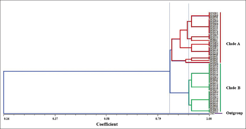 Based on the numeric systematics, 14 qualitative morphological characterizations [Table 1] were chosen and employed for the morphological traits of 54 chicken samples. All characteristics were converted into code. For the purpose of cluster analysis, the unweighted pair group method with arithmetic mean technique, as introduced by Patil et al. [16], was utilized. This approach involves grouping entities based on their similarity values. To perform the clustering analysis, the numerical taxonomy system of the multivariate program (NT-SYS) software package version 2.02 [17] was employed. All computations and analysis procedures were executed using this software.