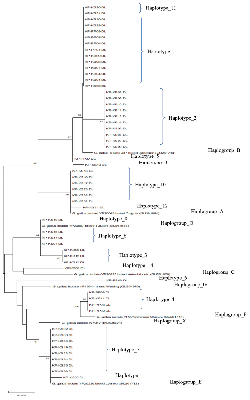 The analysis of the mtDNA D-loop of 54 KP chicken samples reveals the presence of 7 haplogroups, suggesting the existence of more than one maternal origin for the chicken populations in the study. Haplogroup B, consisting of three haplotypes including 1, 2, and 11 (n = 24), was the major haplogroup. This haplogroup most likely originated from Southeast Asia (China).