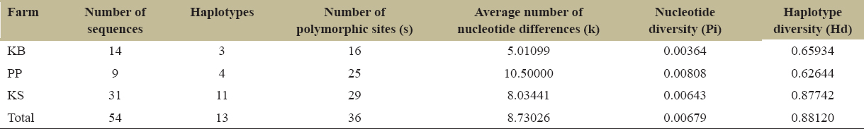 | Farm | Number of sequences | Haplotypes | Number of polymorphic sites (s) | Average number of nucleotide differences (k) | Nucleotide diversity (Pi) | Haplotype diversity (Hd) |