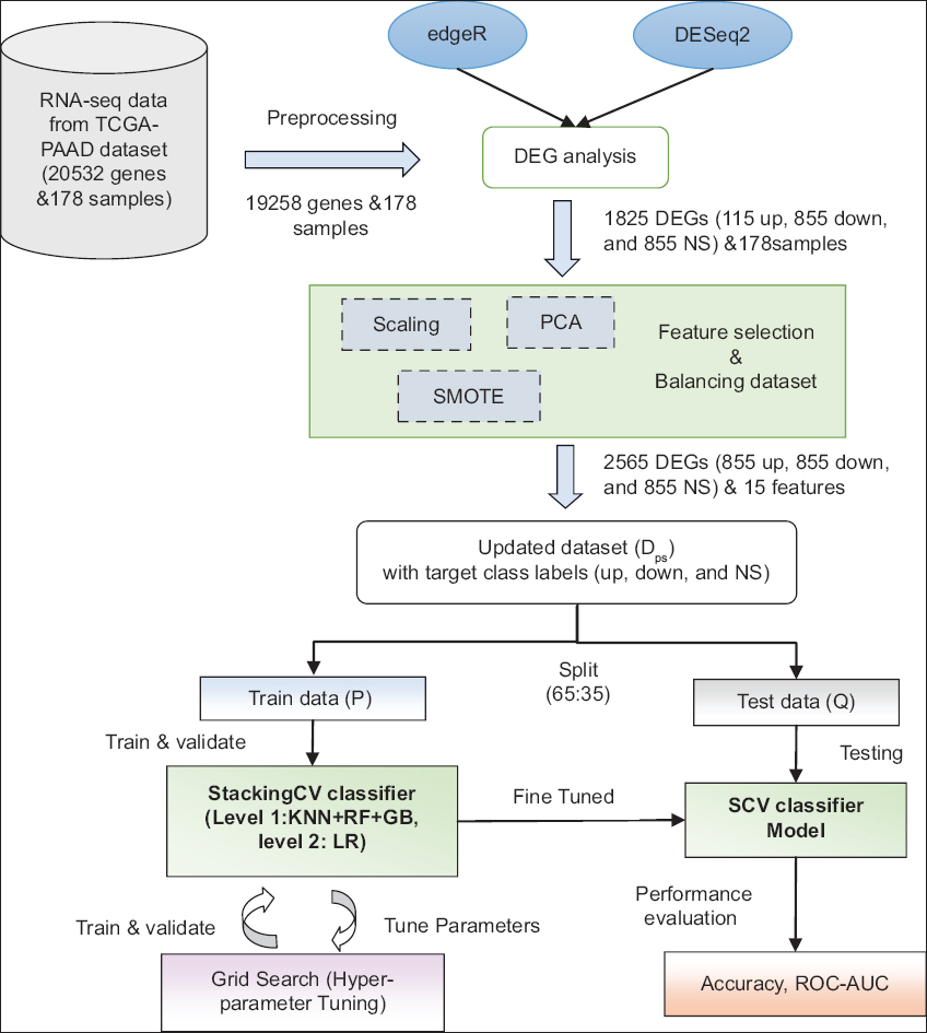 The preprocessed RNA-seq data of size 19,258 × 178 is evaluated for DEGs using edgeR and DESeq2 bioconductor packages in the R language. We set the experimental conditions based on their survival status (alive or deceased) for both tools in DGE analysis. We have collected the DEGs obtained from both tools and constructed a new dataset (D) of 1825 DEGs and 178 features for classification with three target class labels: up (up-regulated), down (downregulated), and NS (not significant). We applied principal component analysis (PCA) as a feature selection technique to identify the principal components (PCs) with high variance [20]. From the PCA results, we have selected the first 15 PCs that show greater than 90% variance in the data. Since the resultant dataset (Dp) is very imbalanced between up and down class labels, we have applied SMOTE to balance each class count [21]. Later, the updated oversampled dataset (Dps) of 2565 genes and 15 feature samples was split into 65% for training and 35% for testing. The stacking CV (SCV) classifier is stacked with K-nearest neighbor (KNN), random forest (RF), gradient boosting (GB), and logistic regression (LR) classifiers. The stack of the first three models acts as a level-1 classifier, and the LR model acts as a level-2 or meta-classifier. We used 10-fold cross-validation, and the hyper-parameters of the models were tuned using the grid search method during the training phase. Finally, the fine-tuned SCV classifier model was tested on the test dataset to evaluate the model’s performance. Figure 1 shows the detailed process of our methodology.