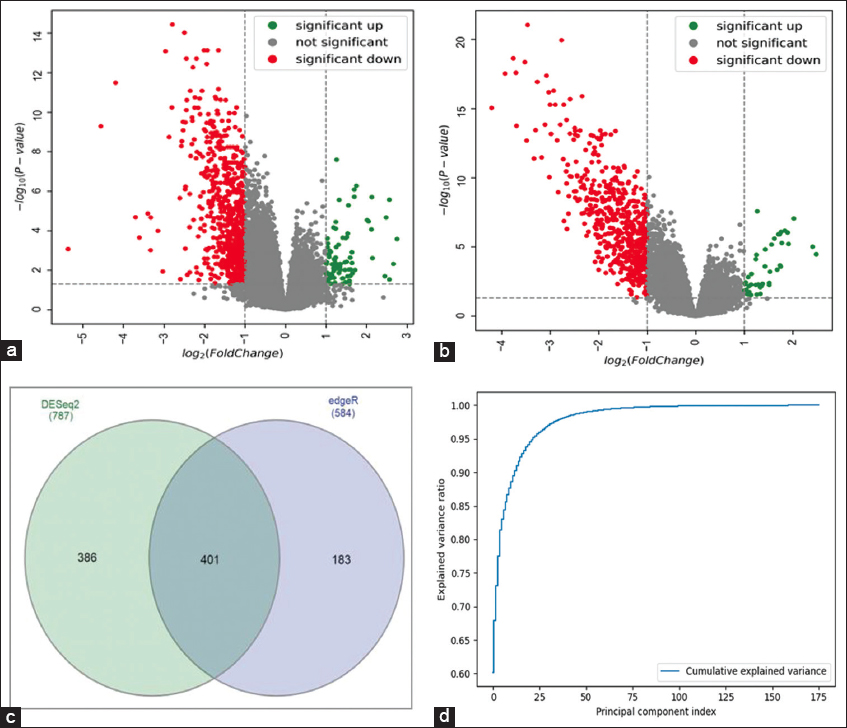 | Figure 3: (a) volcano plot by DESeq2 (b) volcano Plot by edger (c) venn diagram shows common differentially expressed genes between DESeq2 and edgeR results (d) principal component analysis plot explains the relationship between the principal components and their explained variance ratio. [Click here to view] |