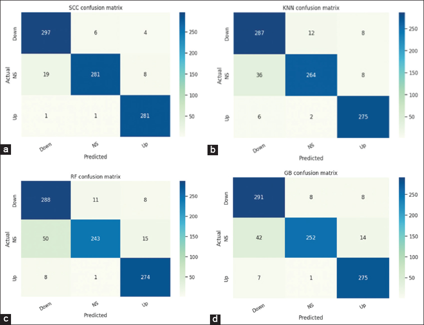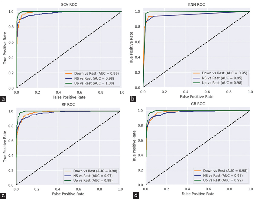 Figure 3d shows the PCA plot between the number of PCs and their explained variance ratio. From the plot, we observe that the first 15 PCs have more than 90% of the explained variance. Table 3 shows the detailed comparison of the performance of various stand-alone ML and other ensemble models with our ensemble SCV classifier. We considered various supervised ML models such as RF, LR, KNN, support vector classifiers (SVC), ensemble models such as GB and extreme gradient boosting (XGB), and a multi-layer perceptron (MLP) model for comparison. The results were shown for three different train-test split categories, and it was observed that our SCV model outperformed in all three categories. The KNN, RF, and GB models are showing the next best performance in terms of accuracy; hence, these models were used as level-1 classifiers in our SCV model. We observed our model performing better with a 65–35 train-test split. The CM (3 × 3) of SCV, KNN, RF, and GB classifiers are shown in Figure 4a-d, respectively. The ROC-AUC curves for SCV, KNN, RF, and GB classifiers are shown in Figure 5a-d, respectively. Each ROC-AUC includes three curves, evaluating each class against other classes using the OvR method. From the figure, our SVC model has the highest area covered under the curve for up versus rest (100%), NS versus rest (98%), and down versus rest (99%).