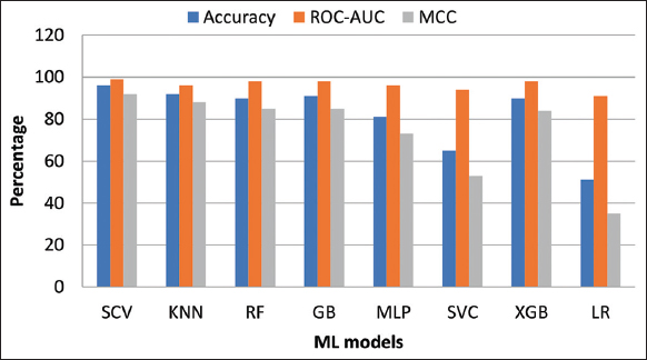 ML: Machine learning, KNN: K-nearest neighbour, RF: Random forest, MLP: Multi-layer perceptron, SVC: Support vector classifier, XGB: Extreme gradient boosting, GB: Gradient boosting, LR: Logistic regression, SCV: Stacking CV