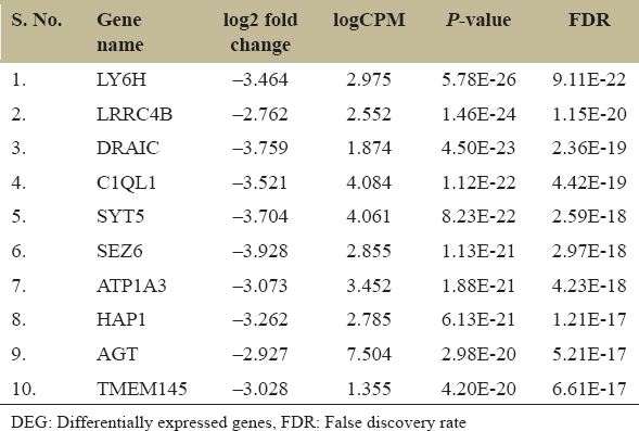 Table 1: List of top 10 DEGs and their statistical values obtained from edgeR tool.