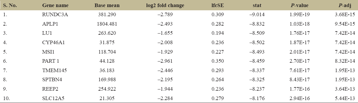 Table 2: List of Top 10 DEGs with their statistical values obtained from DESeq2 tool.
