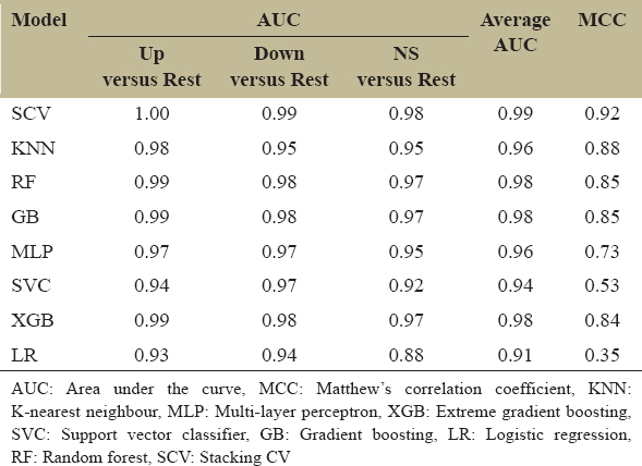 AUC: Area under the curve, MCC: Matthew’s correlation coefficient, KNN: K-nearest neighbour, MLP: Multi-layer perceptron, XGB: Extreme gradient boosting, SVC: Support vector classifier, GB: Gradient boosting, LR: Logistic regression, RF: Random forest, SCV: Stacking CV